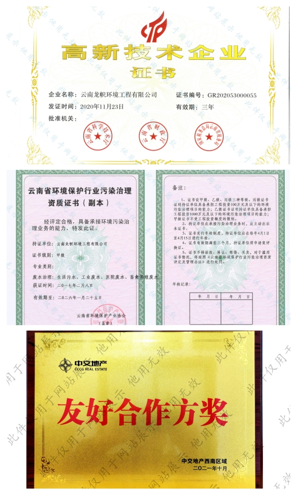 公司持有環(huán)保工程專業(yè)承包二級(jí)、市政公用工程總承包三級(jí)、建筑工程總承包三級(jí)、污染治理乙級(jí)、污染治理設(shè)施運(yùn)行服務(wù)二級(jí)資質(zhì)證書(shū)。前后獲得“十二五”生態(tài)文明建設(shè)突出貢獻(xiàn)單位、云南省省級(jí)成長(zhǎng)型中小企業(yè)、云南省知識(shí)產(chǎn)權(quán)優(yōu)勢(shì)企業(yè)、云南省科技型中小企業(yè)、云南省專精特新中小企業(yè)、招商蛇口最佳合作伙伴、中交置業(yè)友好合作方獎(jiǎng)等榮譽(yù)。